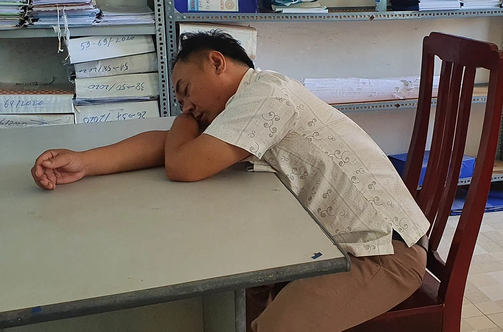 Phạm Hoàng Huynh, Trưởng phòng Đo đạc- bản đồ và viễn thám nằm gục trên bàn khi lực lượng chức năng khám xét nơi làm việc. Ảnh: TẤN LỘC