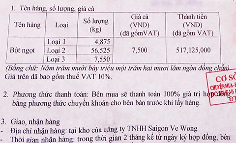 Tại buổi làm việc với C49B, đại diện Công ty Ve Wong (trụ sở tại phường An Phú Đông, quận 12) thừa nhận đơn vị này có ký hợp đồng bán hơn 68 tấn bột ngọt hết hạn sử dụng cho chủ cửa hàng Lệ Hằng. Giá trị hợp đồng là 517 triệu đồng. Công ty đã giao hàng nhiều lần, số lượng hàng chục tấn.