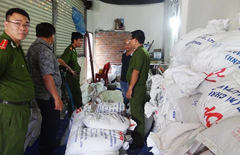 Công an bắt giữ bột ngọt hết hạn sử dụng lưu chứa tại cơ sở Lệ Hằng. Ảnh: TR.THANH