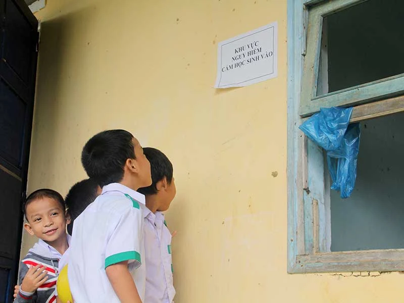 Nhà trường dán thông báo “nguy hiểm, cấm vào” trước cửa phòng học. Ảnh: HUY TRƯỜNG