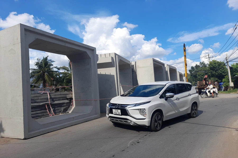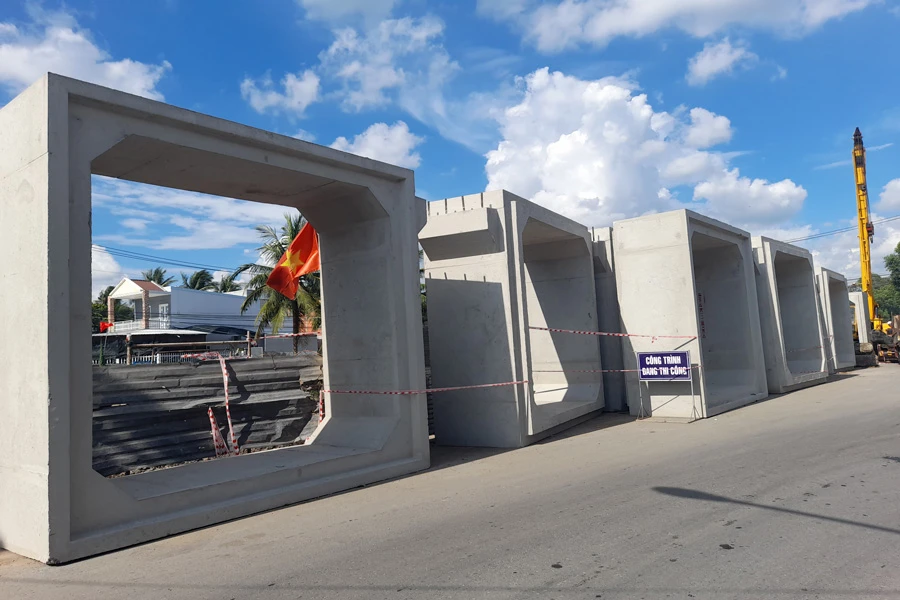 Hàng chục cống hộp dựng đứng cao ngút trên đường. Ảnh: ĐH