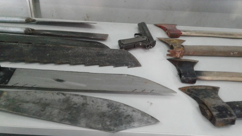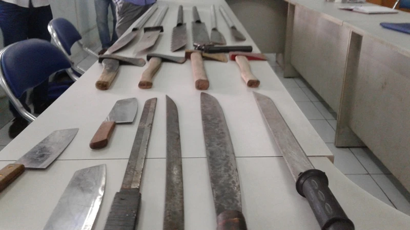 Qua điều tra bắt giữ, các trinh sát thu được sáu đao tự chế dài 2 m, bốn mã tấu, ba dao, bốn rìu, sáu cuốn sổ liên quan đến việc cho vay nặng lãi và một súng bắn đạn bi.