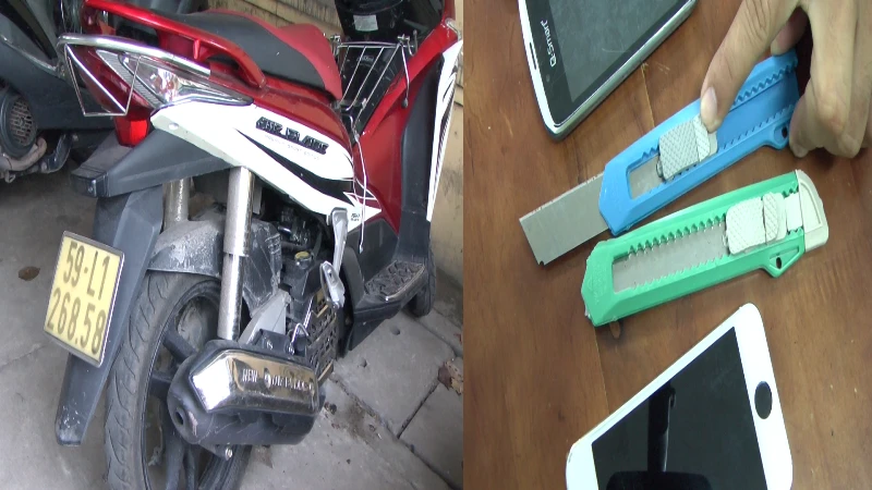 Bằng thủ đoạn trên, cách đây 4 ngày, vào lúc 2h sáng, hai đối tượng Dương và Sơn cướp chiếc xe Airblade biển số 59L1-26858 của một phụ nữ đang lưu thông qua khu vực phường Bình Trưng Đông, Q2 thì bị lực lượng công an phát hiện bắt giữ.
