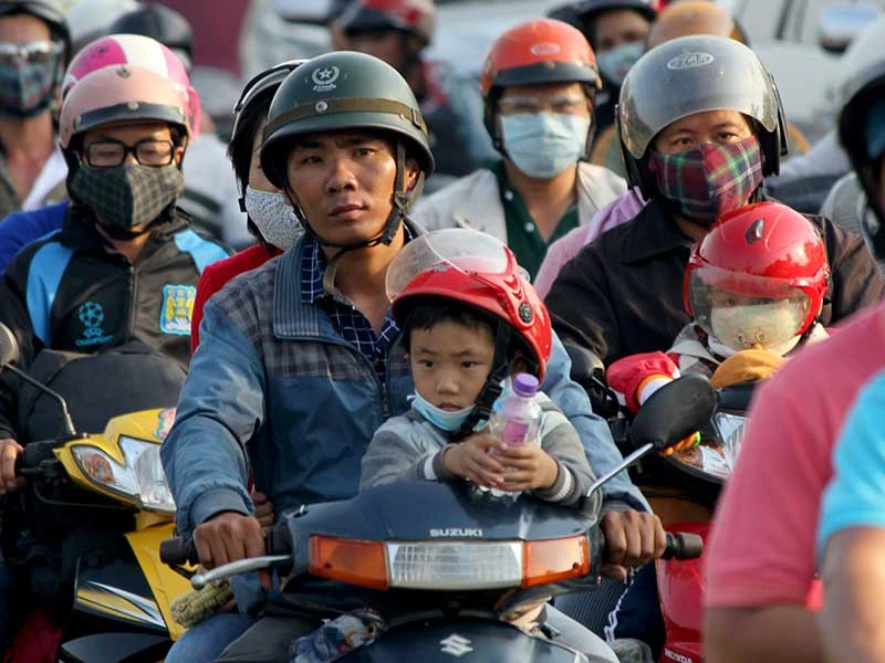 Học sinh, sinh viên, đặc biệt là học sinh từ 6 tuổi trở lên bắt buộc phải đội mũ bảo hiểm. Ảnh: HOÀNG GIANG