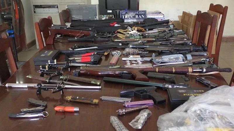 Ngày 23-6, Công an phường Thanh Khê Đông (quận Thanh Khê, TP Đà Nẵng) cho biết, đã tạm giữ một số lượng lớn vũ khí và công cụ hỗ trợ gồm súng bắn đạn bi, kiếm, ba trắc, dao các loại, bình xịt hơi cay, roi điện... được tàng trữ tại nhà Trần Huỳnh Viên (24 tuổi, tạm trú tại phường Thanh Khê Tây, quận Thanh Khê).