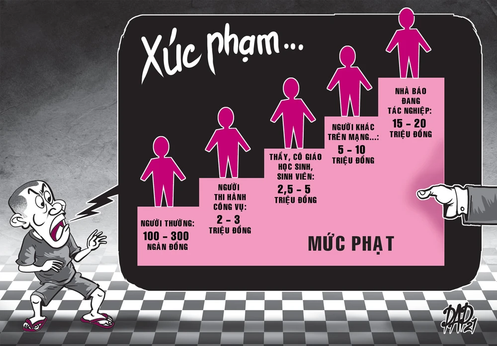 Tính ra, ở thời điểm hiện tại, hành vi xúc phạm danh dự, nhân phẩm nhà báo đang hoạt động báo chí có mức phạt tiền cao nhất. Ngược lại, hành vi xúc phạm danh dự, nhân phẩm người bình thường (ở ngoài thực tế) bị phạt thấp nhất.