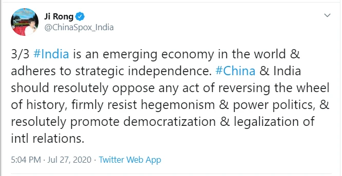 Ngày 27-7, bà Kê Dung, người phát ngôn Đại sứ quán Trung Quốc tại Ấn Độ viết trên Twitter rằng Bắc Kinh và New Delhi nên hợp tác chống lại chủ nghĩa bá quyền của Mỹ.