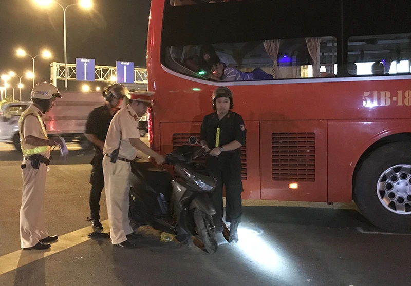 Vào thời điểm này, khi lực lượng CSGT thuộc Đội CSGT Nam Sài Gòn (Phòng PC67 Công an TP.HCM) đang kiểm tra nồng độ cồn tại khu vực này, bất ngờ một xe khách di chuyển từ trên đường Nguyễn Thị Thập (hướng từ cầu Phú Mỹ sang) rẽ phải sang đường Nguyễn Văn Linh.