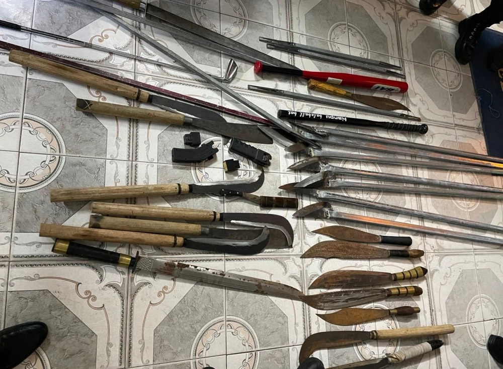 Công an thu giữ nhiều dao ,kiếm, tuýp sắt khi khám xét trụ sở hãng xe khách Phúc Cường