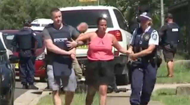 Cảnh sát đưa một phụ nữ ra khỏi tòa nhà (Ảnh: 7News)