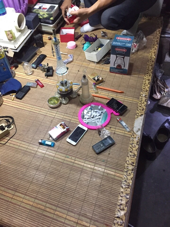 Khám xét khẩn cấp chỗ ở của Hùng, lực lượng phá án đã phát hiện và thu giữ thêm 21 gói ma túy (heroin), một gói nylon chứa ma túy đá, một túi nylon chứa ma túy (heroin), hai bộ đồ sử dụng ma túy đá, hai cân điện tử, bốn ống nhựa dùng để chia ma túy, 90 tờ giấy nhỏ dùng để gói ma túy, 300 túi nylon để đựng ma túy đá, năm dao kiếm các loại, hai bình xịt hơi cay và một dùi cui điện.