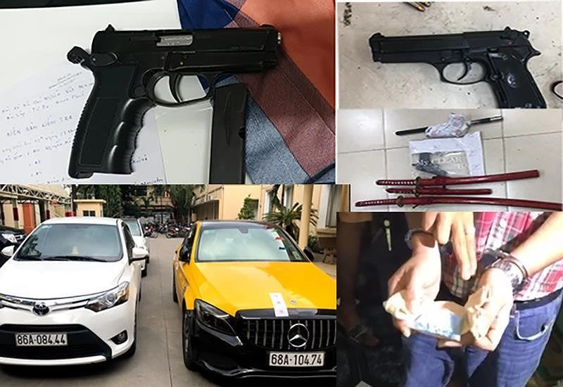 Cảnh sát phát hiện trên xe có 1 khẩu súng, 1 thanh kiếm, 1 bịch nylon chứa tinh thể rắn nghi ma túy đá.