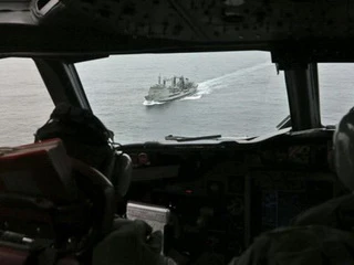 Phi công máy bay trinh sát AP-3C Orion của Không lực Hoàng gia Úc đang bay lướt qua tàu hải quân HMAS Success (Úc) khi đang tìm kiếm máy bay Malaysia mất tích - Ảnh: Reuters
