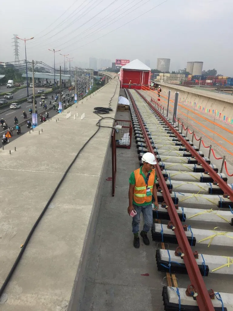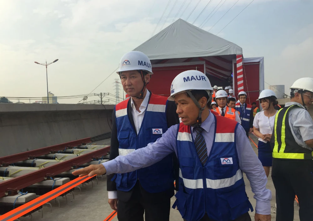 Ông Lê Nguyễn Minh Quang (phải) giới thiệu với Phó Chủ tịch Trần Vĩnh Tuyến quy trình hàn, lắp ráp hệ thống đường ray. Theo đó, từng thanh ray dài 25 m sẽ được nối với bảy thanh khác thành một dây ray dài 200 m. Sau đó từng dây ray sẽ được đẩy trên hệ thống con lăn từ ga Phước Long ngược ra ga Thủ Đức. Từ ga Thủ Đức, các dây ray được đặt lên hệ tà vẹt, hộp chống rung và sau đó đổ bê tông kết nối với mặt sàn của hệ dầm nhịp cho hai đường chạy tàu metro. Từ ga Thủ Đức, ray được lắp chạy vào hướng ga Bình Thái và lần lượt đi vào các ga trong nội đô. Cũng từ ga Thủ Đức, hệ thống đường ray được lắp theo hướng ra các ga cửa ngõ TP và điểm cuối là ở depot Long Bình, quận 9. "Theo kế hoạch, đến cuối năm 2018 sẽ lắp xong hơn 19 km đường ray, hai chiều của tuyến metro để chuyển sang giai đoạn lắp hệ thống điện cơ, đầu máy-toa xe và sang năm 2019 thì chạy thử..." - ông Quang cho biết.