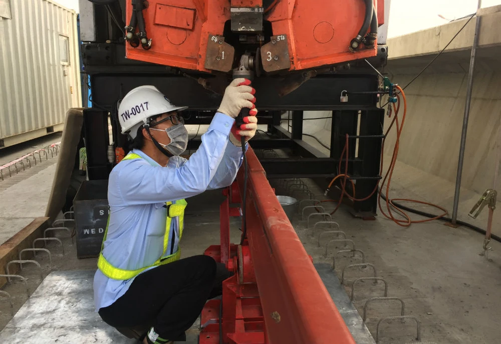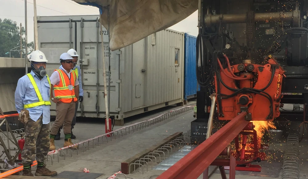 Đúng 8 giờ sáng nay (24-10), tại nhà ga Phước Long, công đoạn hàn nối các thanh ray đầu tiên của tuyến metro số 1 Bến Thành-Suối Tiên được tiến hành.