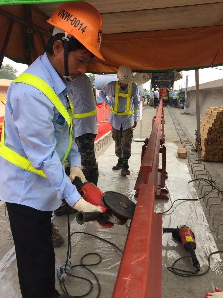 Đúng 8 giờ ngày 24-10, hai thanh ray đầu tiên của tuyến metro số 1 được hàn nối lại với nhau.