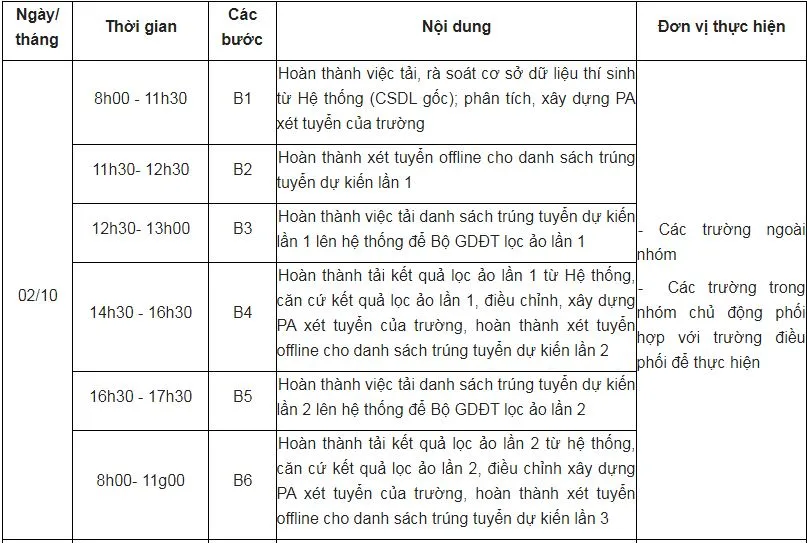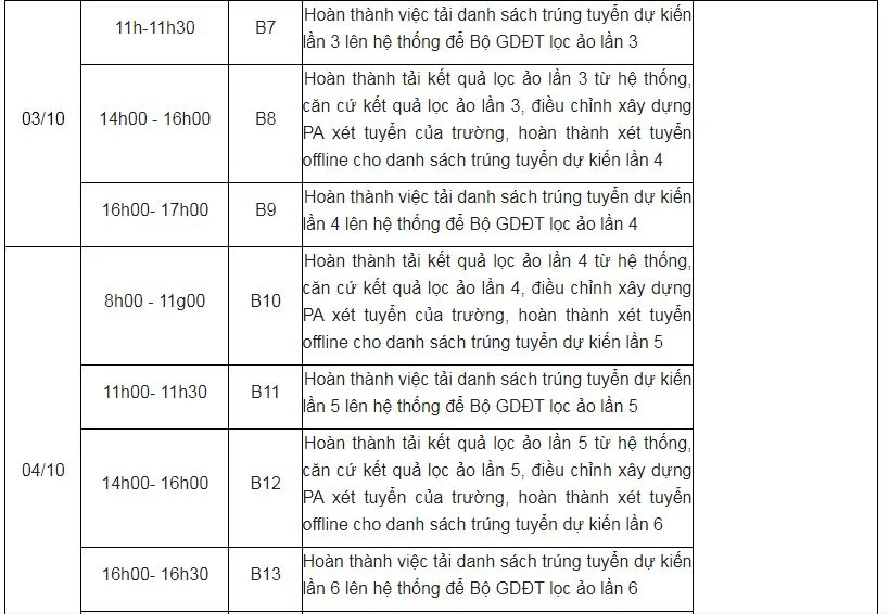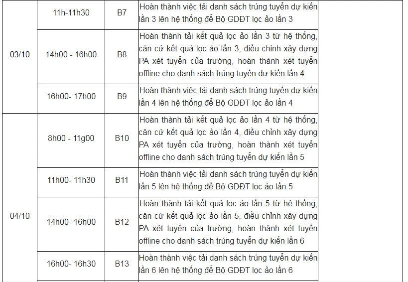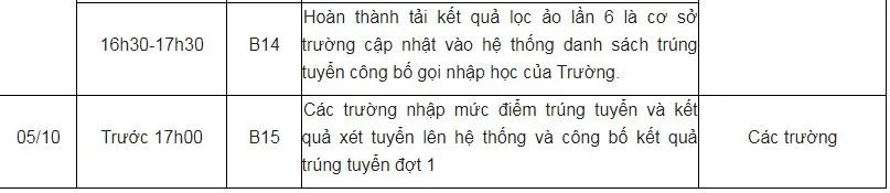 Trước 17 giờ ngày 14-10, các trường cập nhật thông tin thí sinh xác nhận nhập học vào cơ sở dữ liệu của cổng thông tin tuyển sinh của Bộ GD&ĐT. Từ ngày 15-10, các trường có thể xét tuyển bổ sung đợt hai.