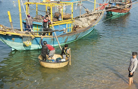Chiều 4-5, ngư dân xã Kỳ Lợi, thị xã Kỳ Anh, Hà Tĩnh ra âu thuyền gần dự án Formosa để ra khơi đánh bắt hải sản. Ảnh: Đ.LAM