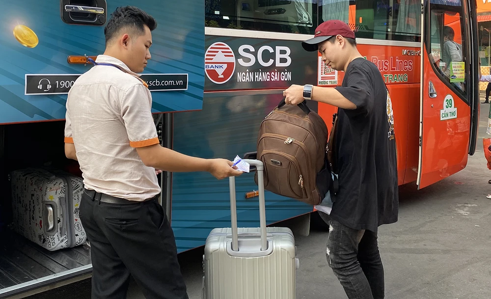 Những hành khách đầu tiên đưa hành lý, lên xe về quê ăn tết từ Bến xe Miền Tây trong chiều 14-1. Ảnh: L.ĐỨC