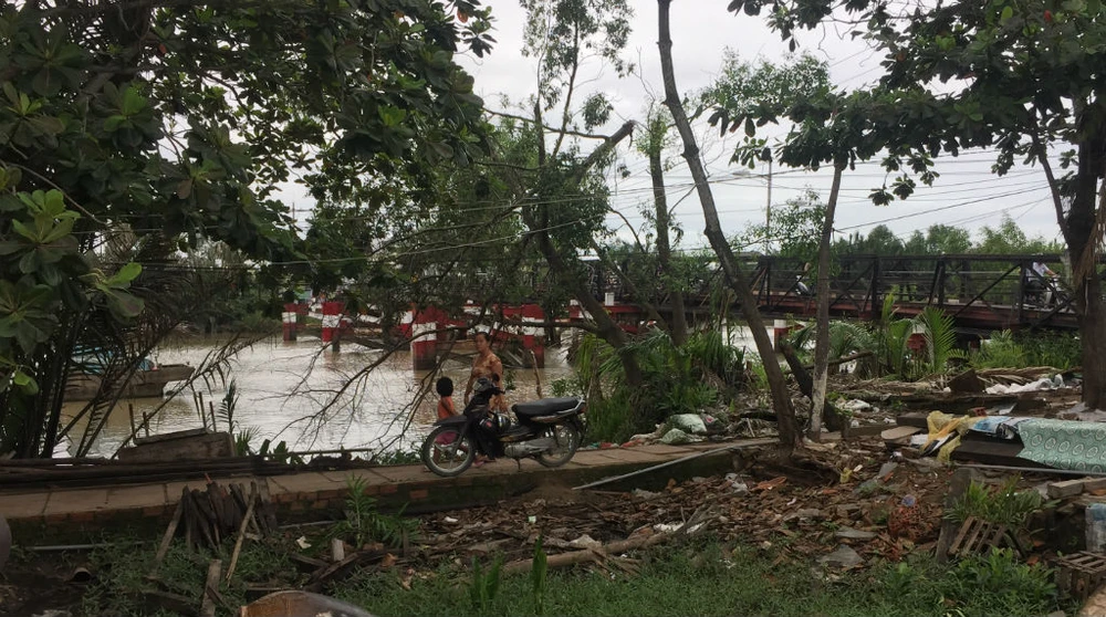 Trong sáng 9-8, công nhân trên công trình cùng người dân xã Phước Kiển nằm trong phạm vi công trình thu dọn mặt bằng vừa giải tỏa, di dời để bước ngay vào việc xây dựng cầu mới.