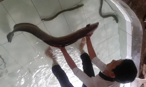 Trong bể cá của ông Đạt có thả một số cá chình cùng loại. Thông thường cá chình trưởng thành lúc đạt cân nặng lý tưởng nhất cũng chỉ đạt trên dưới 1kg. Đây là con cá chình “khủng” nhất mà ông Đạt từng thấy. Trước đó, trong năm 2013, ông cũng mua được một con cá chình cân nặng gần 9kg do một ngư dân tỉnh Bình Phước bắt được.