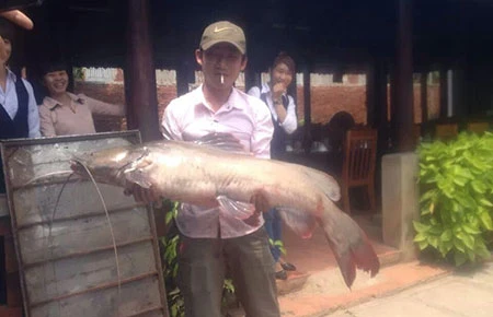 Nhân viên nhà hàng giới thiệu con cá lăng “khủng”. Ảnh: N.HOÀNG