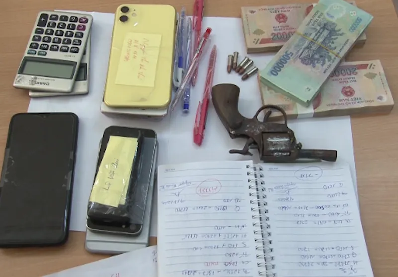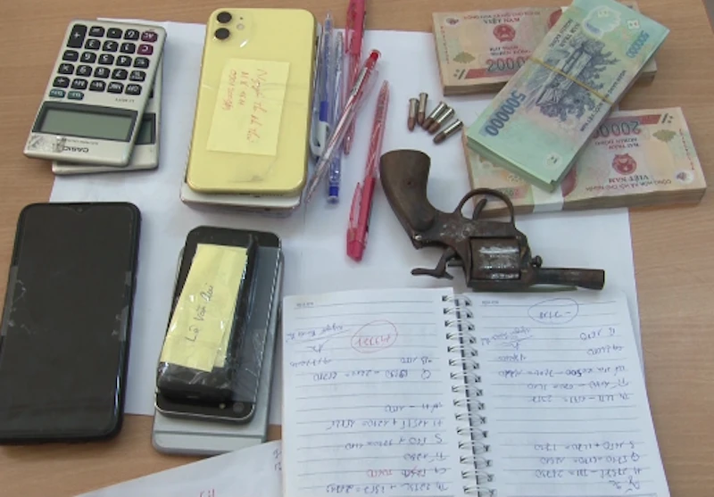 Liên quan đến hai người này, công an thu giữ một khẩu súng tự chế, năm viên đạn, 90 triệu đồng và sáu tờ tịch lô đề.