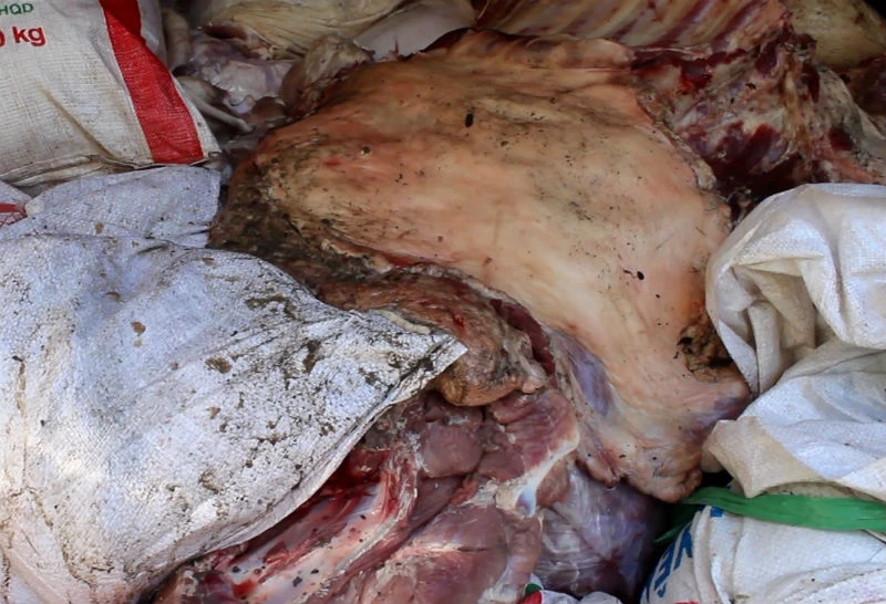 Trước đó, tối 18-11, lực lượng chức năng đã kiểm tra bên trong hai xe tải phát hiện gần 5 tấn thịt heo không rõ nguồn gốc, không có giấy chứng nhận kiểm dịch động vật. Toàn bộ số hàng trên được đông lạnh, có chất phụ phẩm, bốc mùi hôi thối và đang chuyển màu. Trong xe, một số tảng thịt heo lớn có xuất hiện những cục hạch to bằng đầu ngón tay và chuyển màu thâm.