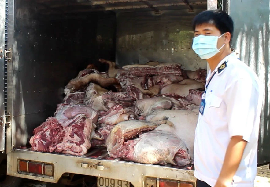 Gần 5 tấn thịt heo bốc mùi hôi thối bị cơ quan chức năng bắt giữ.