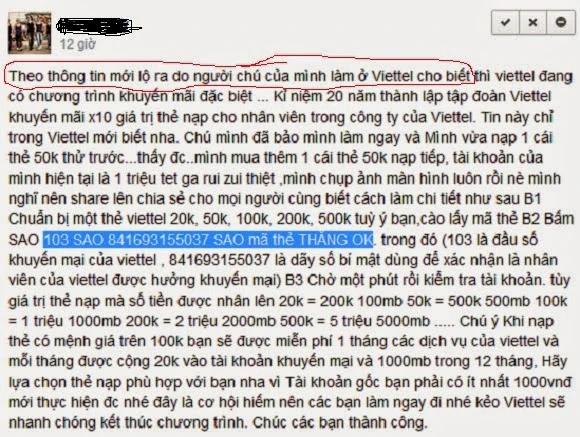 Nội dung các tin nhắn sẽ có dạng kiểu như: “Nhân dịp kỉ niêm ngày..... nhân viên công ty của Viettel sẽ được nhận một mã số bí mật, khi nạp tiền vào tài khoản thông qua mã số bí mật ấy sẽ được khuyến mại x10 giá trị thẻ nạp được. Tin này chỉ trong nội bộ Viettel mới biết. Nhà mình có người làm ở viettel và đã hướng dẫn mình vừa nạp 1 cái thẻ 100k thử trước thấy được mình mua thêm cái thẻ nạp tiếp, tài khoản của mình hiện tại là 2 triệu rồi”....