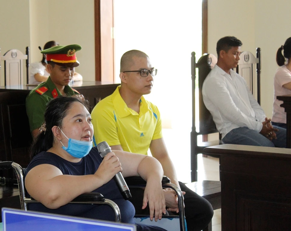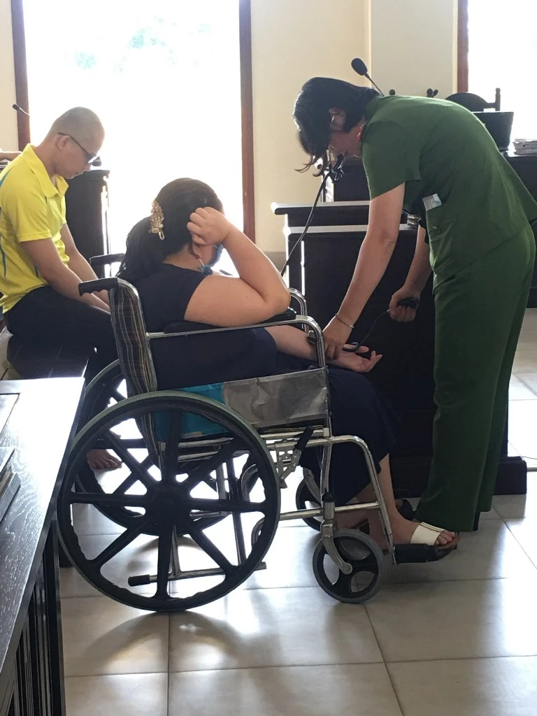 Tạ Thu Thảo ra tòa trên xe lăn, trình bày lưu loát các ý kiến của mình trước tòa. Bị cáo Huyên mặc áo vàng. Ảnh: NHẪN NAM