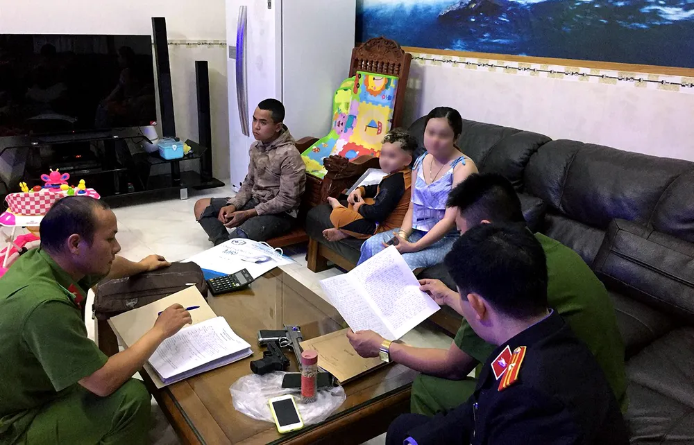 Khám xét tại nhà Đức, công an còn phát hiện nhiều vũ khí, công cụ hỗ trợ như súng bắn bi, súng bắn đạn cao su, đao, kiếm, mã tấu...
