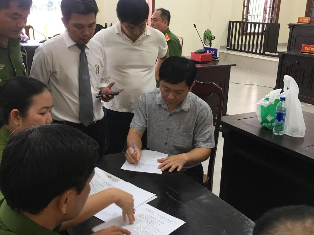 Bị cáo Vũ Bình ký giấy tờ làm thủ tục vào trại giam tại toà.
