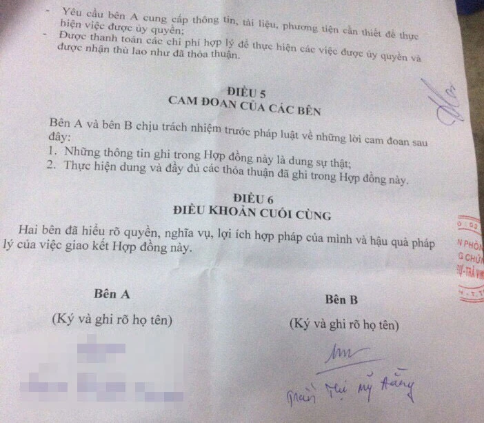 Chữ ký của Hằng trong một hợp đồng công chứng.