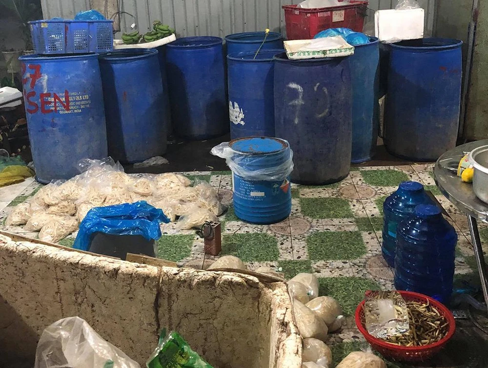 Ngoài ra công an cũng thu giữ 200kg chất tẩy trắng, 5kg hàn the, 100kg acid acetic. Đây đều là những hoá chất không dùng cho người ăn. Khu vực sản xuất thì dơ bẩn, không đảm bảo vệ sinh.