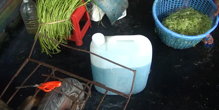 Số hóa chất này được dùng trong việc nhuộm, in quần áo thế nhưng đã được các hộ dân tại đây cho vào ngâm rau muống bào để được tươi và xanh hơn, sau đó sẽ đem ra tiêu thụ ở thị trường bên ngoài.