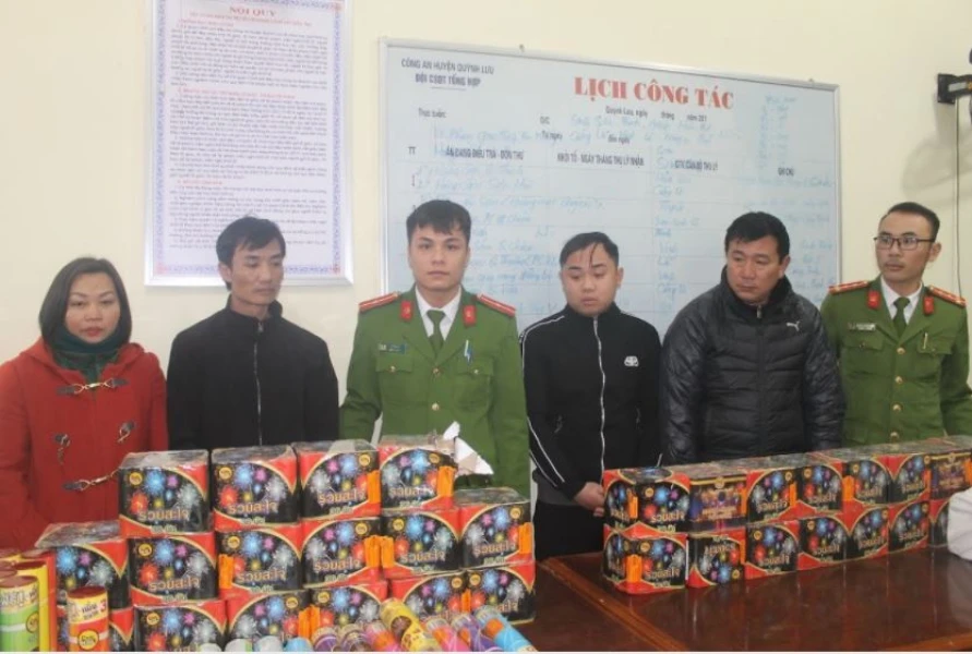 Trong ngày 15-1, Công an huyện Quỳnh Lưu bắt Hoàng Thị Vân (65, tuổi, trú thị trấn Cầu Giát, huyện Quỳnh Lưu) đang ôm 10 bánh pháo loại 49 quả và 10 gói pháo bi (tổng khối lượng 23,7 kg) đi bán.