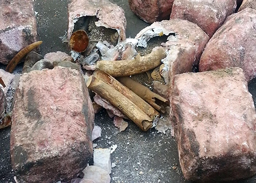 Bên trong vỏ bọc đá cẩm thạch làm giả bằng xốp là gần 700kg ngà voi, sừng tê giác châu Phi. Ảnh: VNE