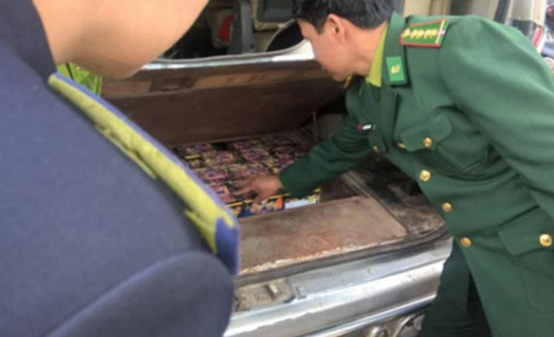 Bộ đội Biên phòng kiểm tra phát hiện pháo được cất trong "hầm" bí mật phía sau xe.