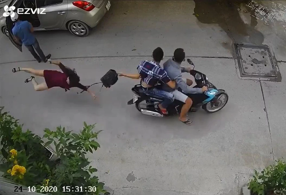 Hai kẻ giật túi xách ra tay bị camera an ninh ghi lại. Ảnh cắt từ clip