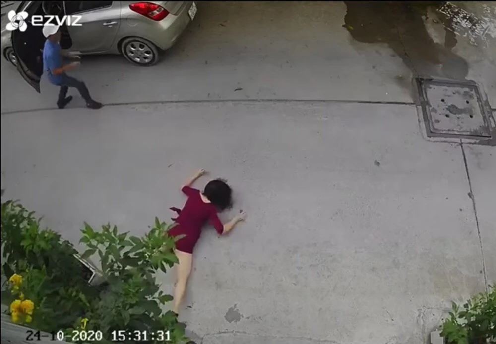 Nạn nhân bị ngã đập đầu xuống đường sau vụ giật túi xách. Ảnh cắt từ clip