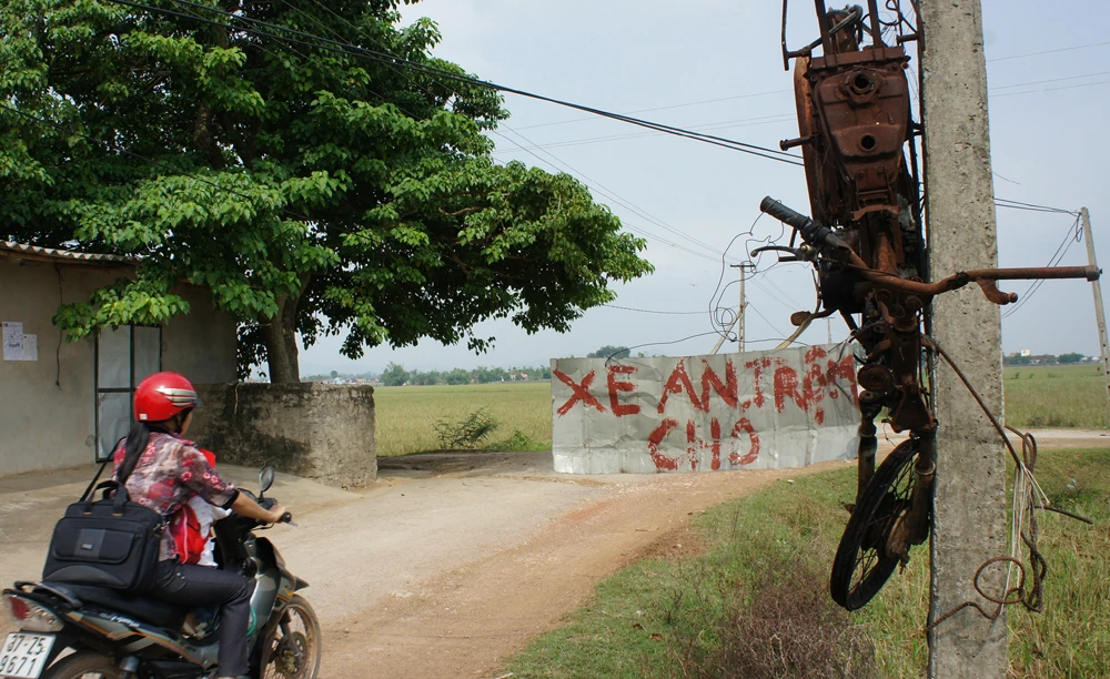 Người dân huyện Yên Thành (Nghệ An) bắt giữ và đốt xe máy của kẻ trộm chó rồi treo lên trên cột điện ở ngã tư để “răn đe” kẻ khác. Ảnh: Đ.Lam