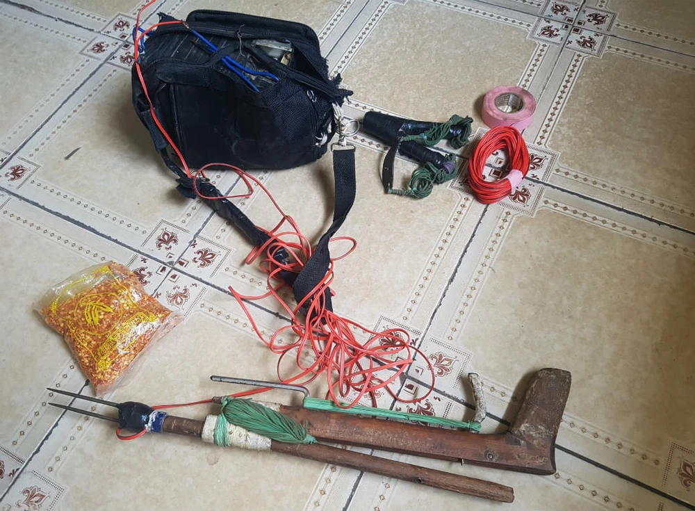 Khám xét tại chỗ công an phát hiện trên xe của nghi can 5 con chó đã chết và công cụ để bắt trộm chó gồm bình điện, chĩa nhận. Đặc biệt trong người nghi can có một bích ớt bột, bình xịt hơi cay và súng cao su đùng để tấn công người truy đuổi.