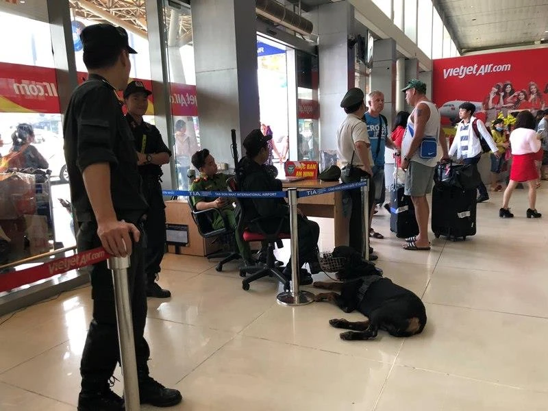 Lúc cao điểm khách đi lại, ngoài lực lượng tuần tra, an ninh hàng không thắt chặt và đưa chó nghiệp vụ vào tại ga quốc nội sân bay Tân Sơn Nhất. Ảnh: AN NHIÊN