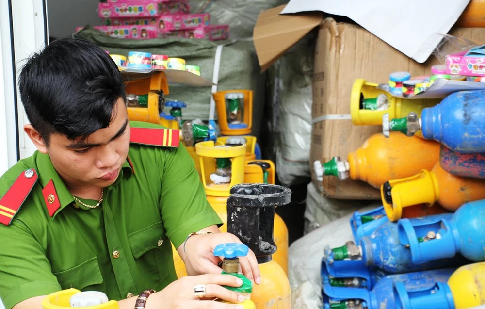 Công an tạm giữ số bình khí cười để điều tra. Ảnh: HẢI HIẾU