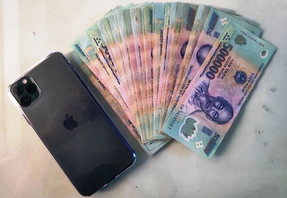 Điện thoại iPhone 11 Pro Max và tiền mặt công an thu hồi được. Ảnh: HẢI HIẾU