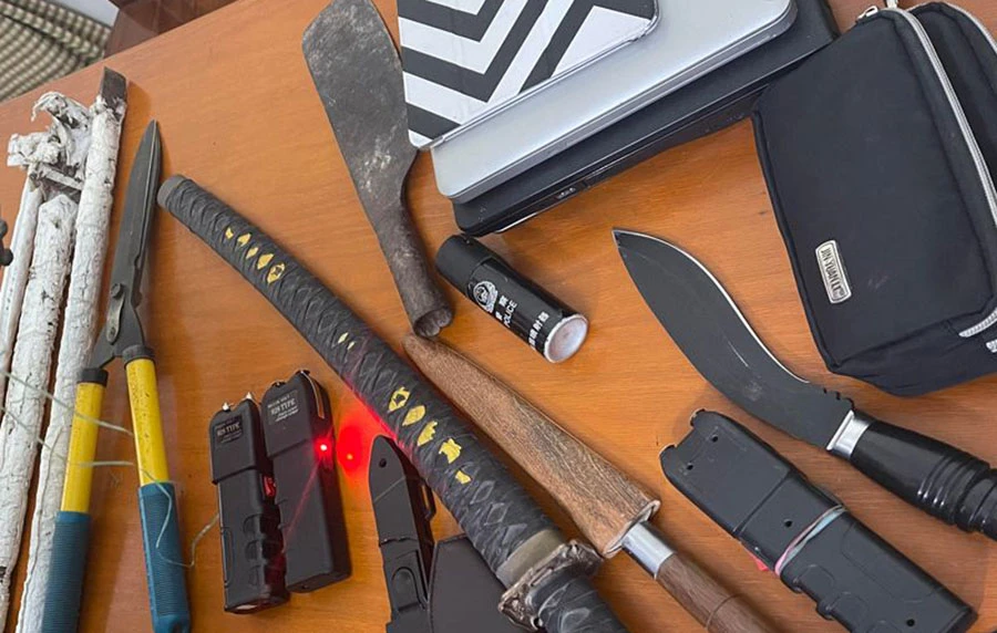 Công an thị xã Nghi Sơn đã thu giữ gồm xà beng, cưa sắt, dùi cui điện, dao, mã tấu... là những dụng cụ đối tượng này sử dụng để gây án.
