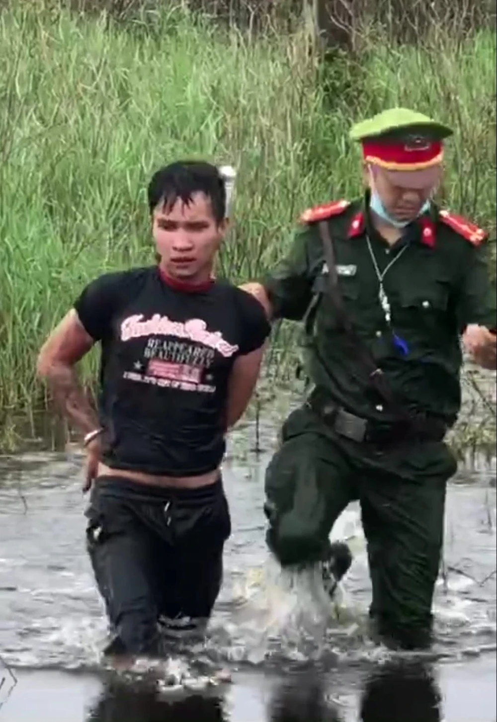 Phát hiện có lực lượng công an theo dõi, kẻ trộm đứng dậy bỏ chạy ra khu vực rừng keo, hòng trốn thoát. Ngay lập tức, tổ công tác đã truy đuổi.