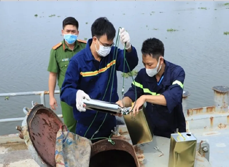 Công an lấy mẫu xăng trên phương tiện thủy các đối tượng đang vận chuyển. Ảnh: VH