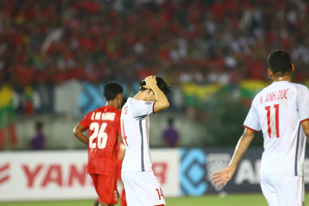 Sau những phút đầu nhường thế trận cho chủ nhà Myanmar, Việt Nam bắt đầu tăng tốc trong nửa cuối hiệp đấu nhưng hàng loạt tình huống ngon ăn lại bị bỏ lỡ. Kết thúc hiệp 1, Myanmar và Việt Nam rời sân với kết quả hòa 0-0.